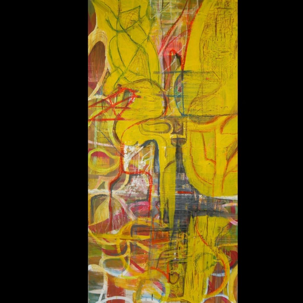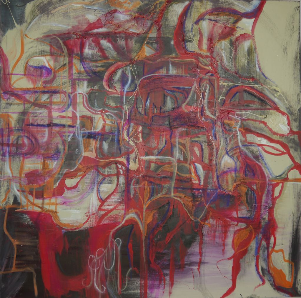 Acrylic, pastel, string on canvas